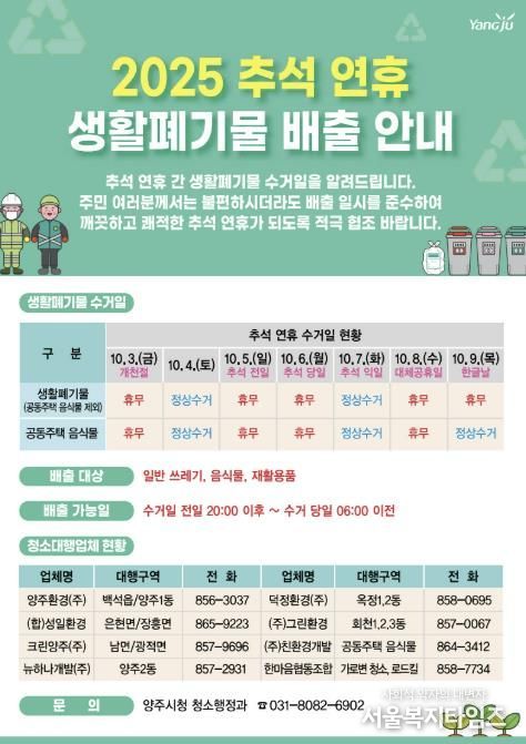 서울복지타임즈 이재연 기자 | 양주시가 다가오는 추석 연휴 동안 ‘2025년 추석 연휴 생활폐기물 관리 대책’을 추진한다.