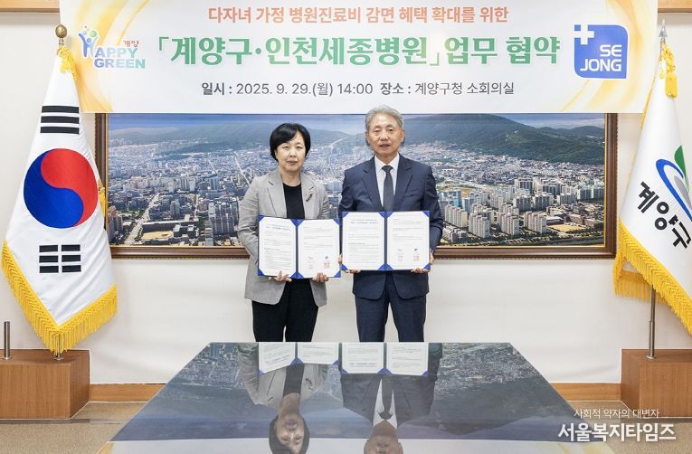 서울복지타임즈 이재연 기자 | 인천광역시 계양구는 9월 29일 인천세종병원(병원장 오병희)과 ‘다자녀 가정 병원진료비 감면 확대’를 위한 업무협약을 체결했다.