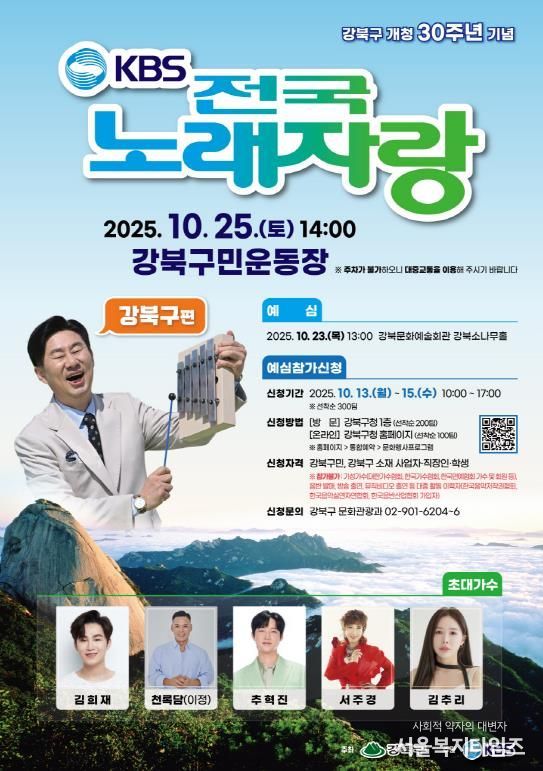 서울복지타임즈 이재연 기자 | 강북구는 개청 30주년을 기념해 오는 10월 25일 오후 2시 강북구민운동장에서 KBS 장수 예능 프로그램 ‘전국노래자랑’ 강북구편을 개최한다고 밝혔다.