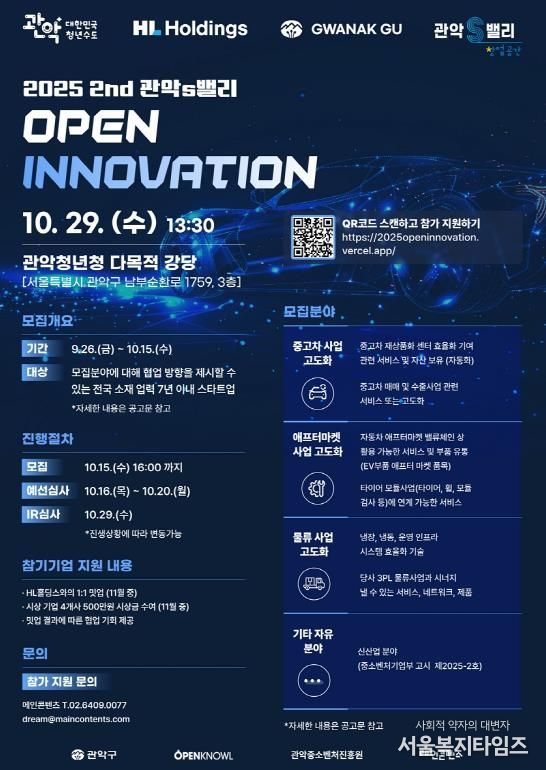 서울복지타임즈 이재연 기자 | 관악구가 자동차, 물류 분야 글로벌 네트워크를 보유한 ‘HL홀딩스’와 함께 ‘2025 제2회 관악S밸리 오픈 이노베이션’에 참가할 기업을 모집한다.