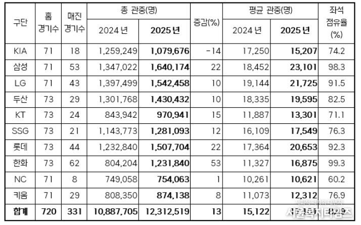 최종적으로 2025시즌은 지난 시즌 보다 약 13% 증가한 1,231만 2,519명의 관중이 입장하며 평균 관중 1만 7,101명을 기록했다. 전체 경기 수의 약 46%인 331경기가 매진됐고, 좌석 점유율 또한 82.9%를 기록했다.
