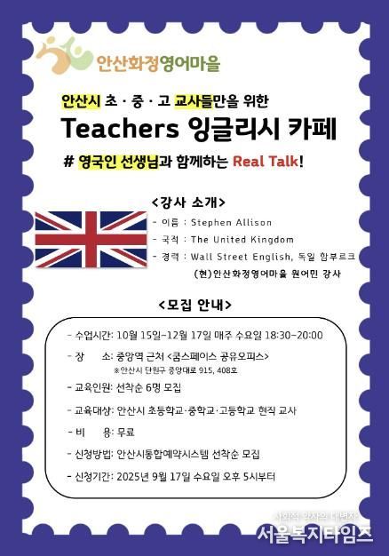 서울복지타임즈 이재연 기자 | 안산시 안산화정영어마을은 오는 15일부터 12월 17일까지 관내 소속 교사를 대상으로 ‘티처스(Teachers) 잉글리시 카페’를 운영한다고 10일 밝혔다.