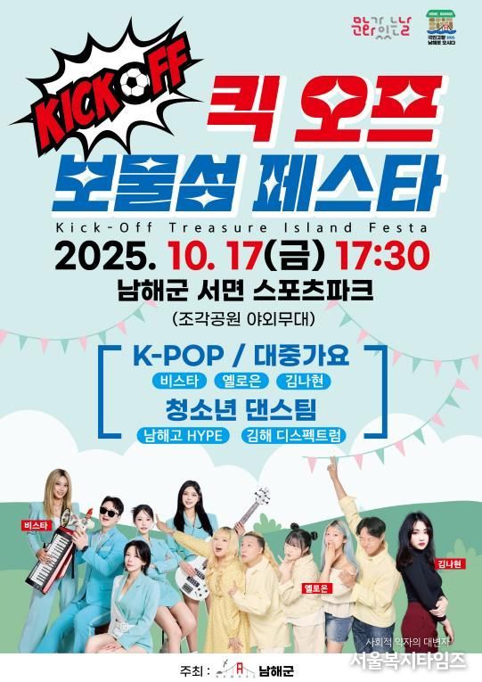 서울복지타임즈 이재연 기자 | 남해군은 오는 17일 오후 5시 30분 서면 스포츠파크(조각공원 야외무대)에서 ‘킥 오프! 보물섬 페스타’를 개최한다고 밝혔다.