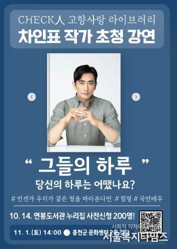 서울복지타임즈 이재연 기자 | 홍천군립도서관은 11월 1일 오후 2시 홍천군 문화센터 2층 강당에서 차인표 작가를 초청하여 체크인 고향사랑 라이브러리 마지막 강연을 개최한다.