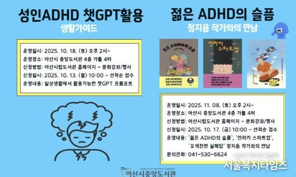 서울복지타임즈 이재연 기자 | 아산시립도서관은 성인 ADHD(주의력결핍 과잉행동장애)에 대한 사회적 인식 개선과 실질적인 생활 지원을 위해 오는 10월과 11월 중앙도서관에서 주제 특강을 운영한다고 밝혔다.