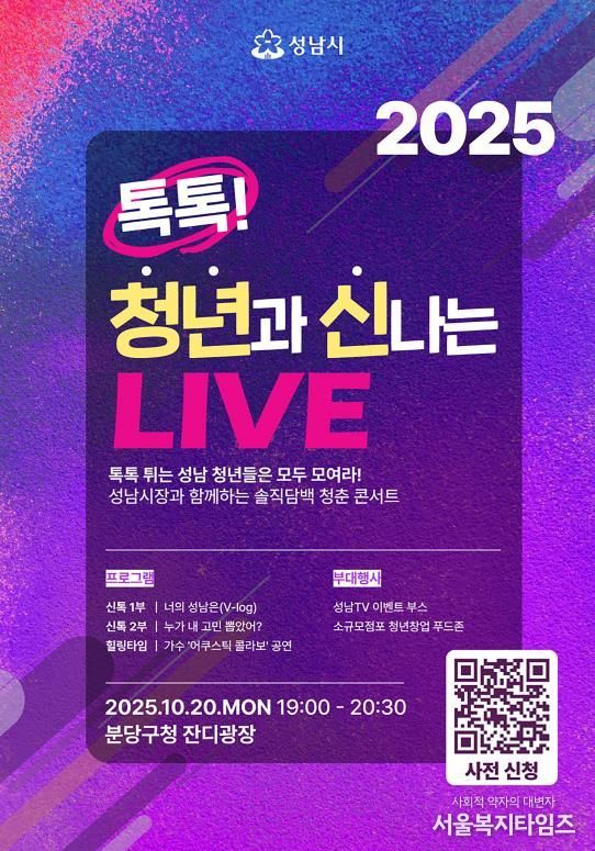 서울복지타임즈 이재연 기자 | 성남시는 청년 세대와의 소통을 강화하고 청년의 목소리를 시정에 반영하기 위해 '톡톡! 청년과 신나는 LIVE'를 오는 10월 20일 오후 7시부터 8시 30분까지 분당구청 앞 잔디광장에서 개최한다.