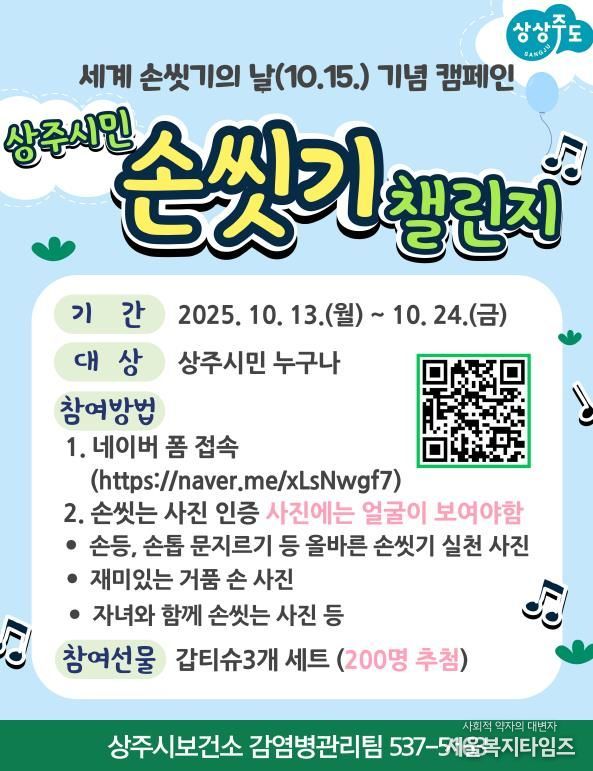 서울복지타임즈 이재연 기자 | 상주시는 ‘세계 손씻기의 날(10.15.)’을 기념하여 10월 13일부터 24일까지‘상주시민 손씻기 챌린지’를 실시한다.