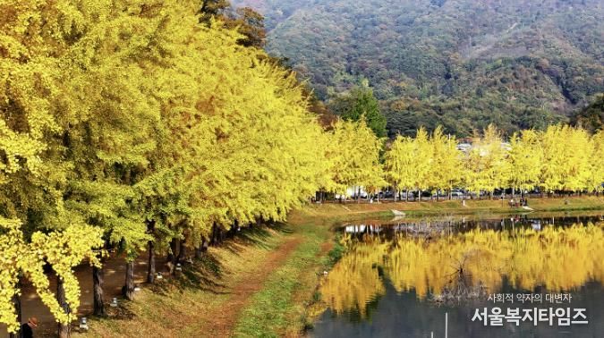 가을 절정의 노란 은행잎이 저수지를 감싸며 장관을 이루고, 인근 논에서는 유색벼로 만든 김홍도의 풍속화 ‘무동’을 감상할 수 있다.