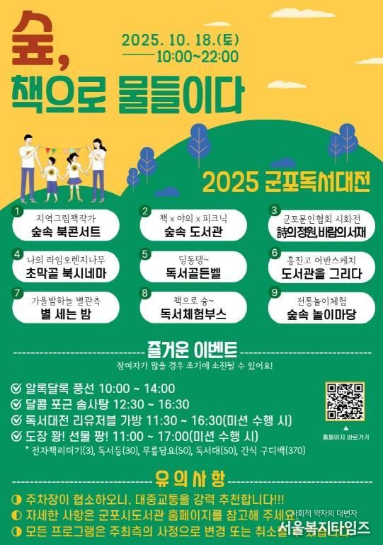 서울복지타임즈 이재연 기자 | 군포시가 민선 8기 공약인 ‘책의 도시 축제 활성화’를 실현하기 위해 오는 10월 18일 초막골생태공원에서 ‘2025 제11회 군포독서대전’을 개최한다.