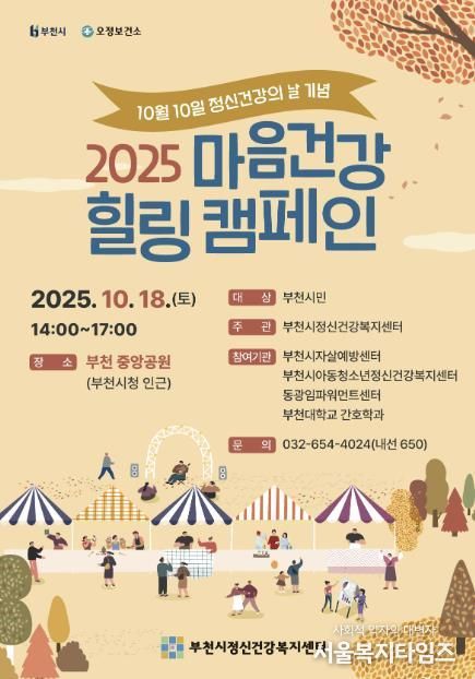 서울복지타임즈 이재연 기자 | 부천시는 부천시정신건강복지센터와 함께 2025년 정신건강의 날(10월 10일)을 기념해 10월 18일 오후 2시부터 부천중앙공원에서 ‘2025 마음건강 힐링캠페인’을 연다.