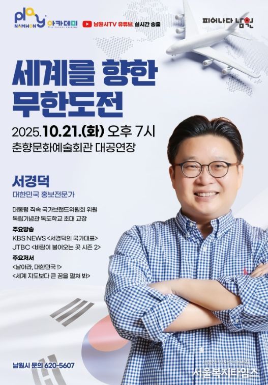 서울복지타임즈 이재연 기자 | 남원시는 오는 21일 오후 7시, 춘향문화예술회관 대공연장에서 대한민국 홍보 전문가 서경덕 교수를 초청해 “세계를 향한 무한도전”이라는 주제로 플레이(Play) 남원 아카데미를 개최한다.