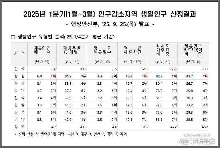 서울복지타임즈 이재연 기자 | 강원특별자치도는 행정안전부가 9월 25일 발표한 ‘2025년 1분기 인구감소지역 생활인구 산정 결과’에서 체류인구 총 2,826,012명으로 전국 최고 수준을 기록했다고 밝혔다.