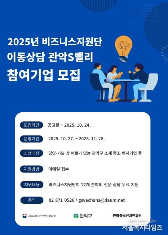 서울복지타임즈 이재연 기자 | 관악구가 관악중소벤처진흥원과 서울지방중소벤처기업청이 협력하여 관내 창업기업의 애로사항 해소와 성장지원을 위한 '2025년 관악S밸리 비즈니스지원단 이동상담‘을 운영한다.