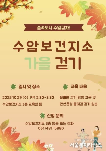 ‘수암 가을 걷기 교실’은 오는 29일(수) 오후 2시 30분부터 3시 30분까지 지역주민 50명을 대상으로 진행된다.