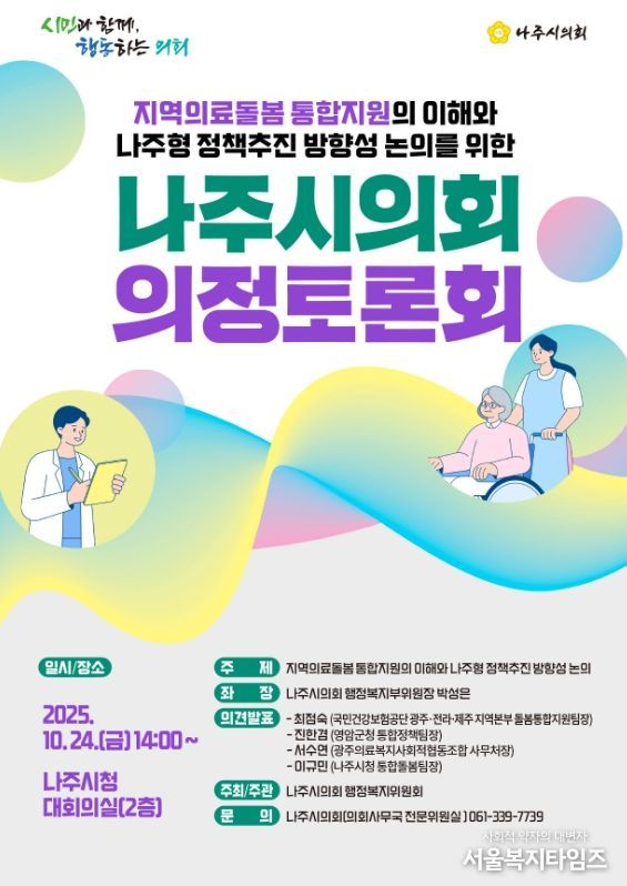 서울복지타임즈 이재연 기자 | 나주시의회은 오는 24일 금요일 14시, 나주시청 2층 대회의실에서 2025년 제1회 나주시의회 의정토론회를 개최한다고 14일 밝혔다.