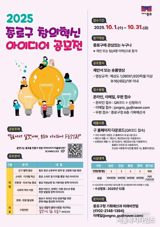 서울복지타임즈 이재연 기자 | 종로구가 주민들의 톡톡 튀는 아이디어를 구정 정책에 반영하기 위해 '2025 종로구 창의혁신 아이디어 공모전'을 개최한다. 접수 기간은 이달 31일까지다.