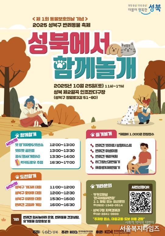 서울복지타임즈 이재연 기자 | 서울 성북구가 2025년 성북구 반려동물 축제 ‘성북에서 함께놀개’를 오는 10월 25일 토요일 성북 제2월곡잔디구장에서 개최한다.