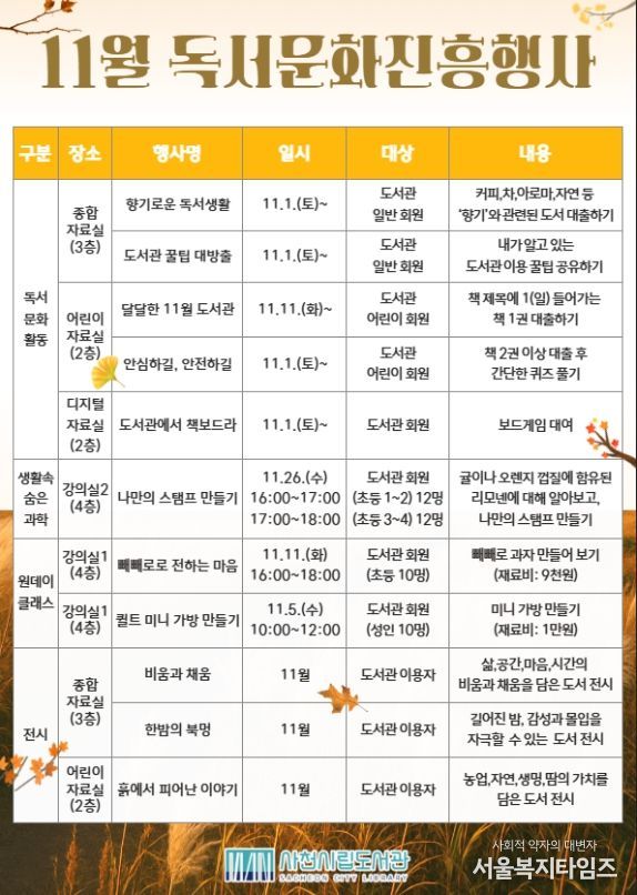 서울복지타임즈 이재연 기자 | 사천시는 사천시립도서관에서 11월 한 달 동안 책과 함께 여유로운 시간을 보내며 감성을 채울 수 있는 다양한 독서문화행사와 체험 프로그램을 운영한다고 17일 밝혔다.