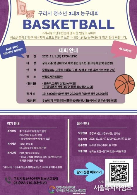 서울복지타임즈 이재연 기자 | 구리시청소년재단 청소년수련관은 '2025 구리시 청소년 3대3 농구대회' 참가 신청을 10월 22일부터 10월 27일까지 온라인으로 신청받는다고 밝혔다.
