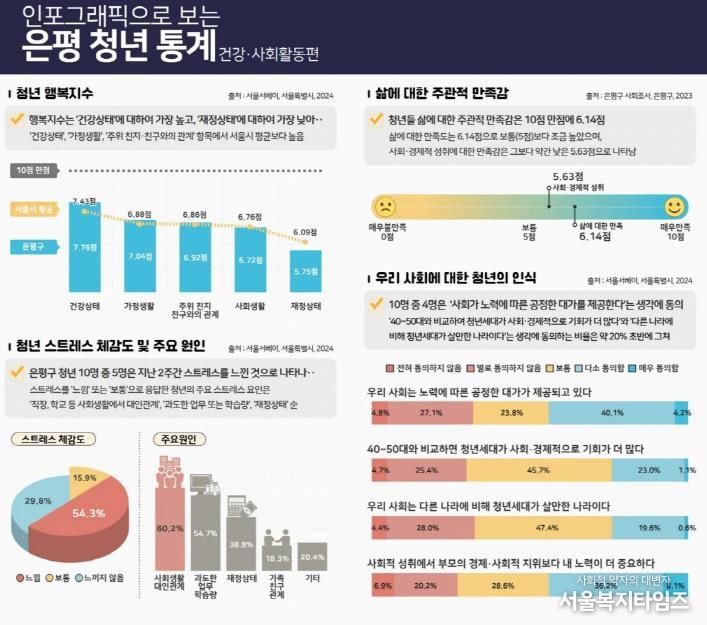 은평구는 그동안 공표된 다양한 통계를 수집하고 분석해 인포그래픽으로 배포해 왔다. 이번 인포그래픽은 은평 청년들의 건강 상태, 행복지수, 스트레스 요인, 우리 사회에 대한 인식, 사회적 지원망 등을 한눈에 볼 수 있도록 시각적으로 정리했다.