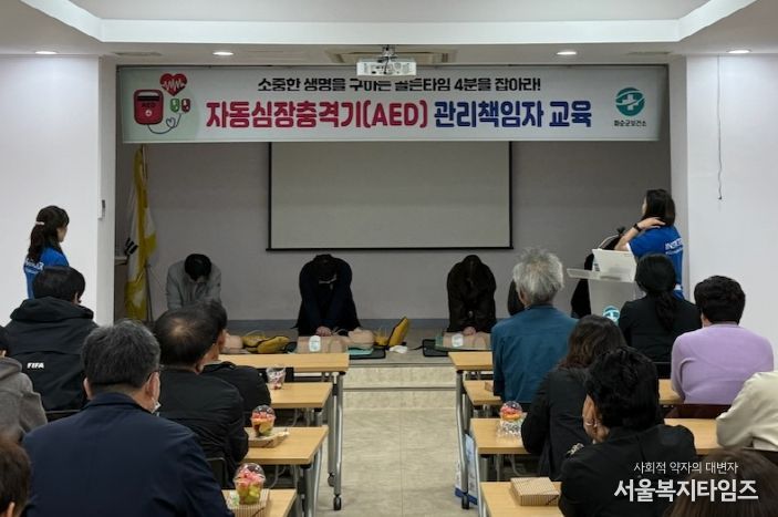 이번 교육은 관내 응급 장비 관리를 강화하고 심정지 등 긴급 상황 발생 시 신속하게 대처할 수 있는 역량을 높이기 위해 마련됐으며, 대한안전연합 소속 강사를 초빙해 ▲일반인 심폐소생술 기본 ▲자동심장충격기 관리 방법 ▲마네킹을 이용한 1:1 실습 ▲실제 응급상황 대비 상황극 등의 내용으로 100분간 진행하여 수료증을 발급했다.