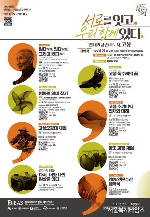 서울복지타임즈 이재연 기자 | 고성군은 동의대학교와 협력하여 수행하는 사업인 ‘2025년도 인문도시사업 인문주간 행사’를 10월 27일 청소년센터 온에서 개막식을 시작으로 11월 2일까지 7일간 개최한다.