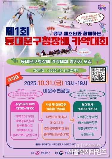 서울복지타임즈 이재연 기자 | 서울 동대문구는 오는 31일 오후 1시부터 7시까지 이문수변공원 내 동대문구 수상스포츠 체험교육장에서 ‘제1회 동대문구청장배 카약대회 및 2025 수상스포츠 땡큐 페스타’를 개최한다.