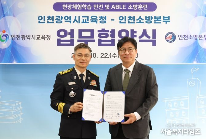 서울복지타임즈 이재연 기자 | 인천광역시교육청은 22일 인천소방본부(본부장 임원섭)와 ‘현장체험학습 안전요원 및 ABLE 소방훈련 협력을 위한 업무협약’을 체결했다.