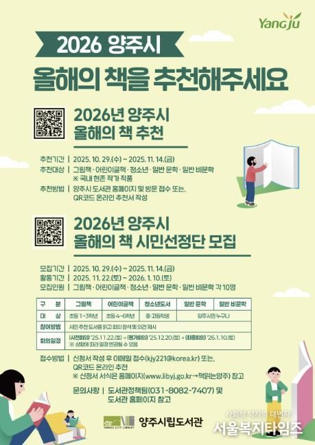 서울복지타임즈 이재연 기자 | 양주시가 11월 14일까지 2026년 양주시 『올해의 책』을 추천받는다.