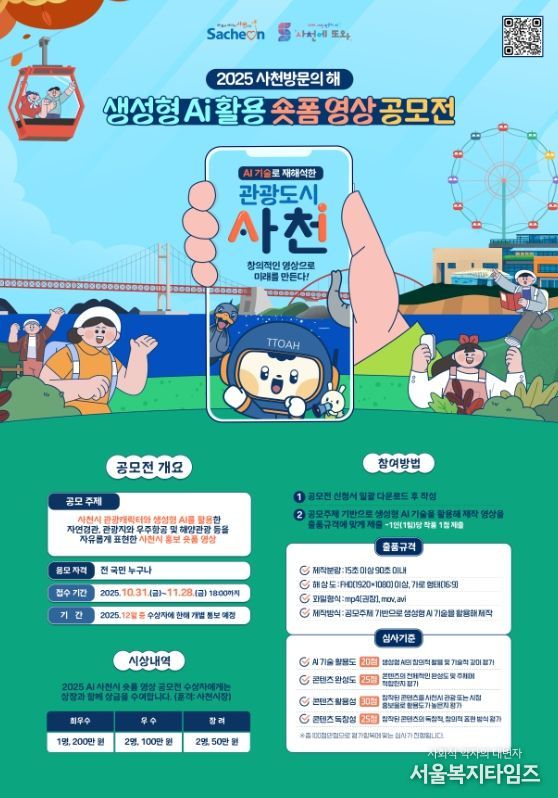 서울복지타임즈 이재연 기자 | 사천시는 2025 사천방문의 해를 맞아 시의 관광자원과 관광 캐릭터에 대한 관심과 인지도를 제고하기 위한 생성형 AI 활용 숏폼 영상 공모전을 10월 31일부터 11월 28일까지 개최한다.