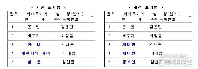 서울복지타임즈 이재연 기자 | 앞으로는 등·초본 상 가족 관계 표기로 인한 재혼 가정의 사생활 노출을 방지하기 위해 세대주와의 관계 표기 방식이 개선된다.