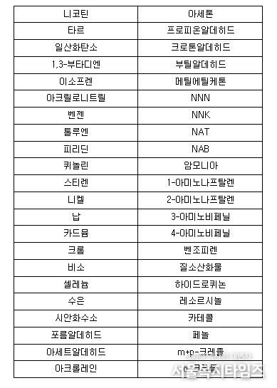 위원회는 검사의 대상이 되는 담배 유해성분 목록과 유해성분별 시험법도 의결했다. 이는 올해 행정예고(3월 6일부터 2개월)를 완료하고 현재 규제심사를 진행하고 있는'담배 유해성분 지정 등에 관한 규정'(식품의약품안전처고시)에 담겨 있다. ①유해성분의 경우, 궐련 및 궐련형 전자담배에 대하여는 타르 및 니코틴을 포함한 44종을, 액상형 전자담배에 대하여는 니코틴, 프로필렌글리콜, 글리세린 등 20종을 지정했다. ②시험법의 경우, 세계보건기구(World Health Organization, WHO), 국제표준화기구(International Organization for Standardization, ISO) 등 국제기구에서 개발된 표준시험법을 참고하여 마련했다.