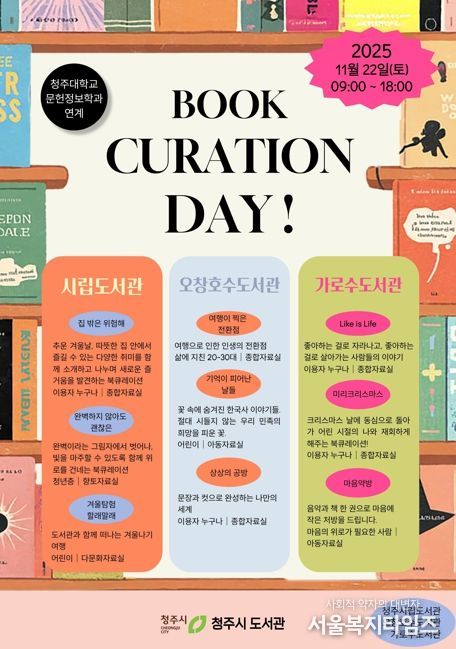 서울복지타임즈 이재연 기자 | 청주시립도서관은 청주대학교 문헌정보학과(지도교수 김혜영)와 함께 오는 22일 오전 9시부터 오후 6시까지 △시립도서관 △오창호수도서관 △가로수도서관 등 3개 도서관에서 ‘북큐레이션 데이’를 동시에 개최한다고 밝혔다.