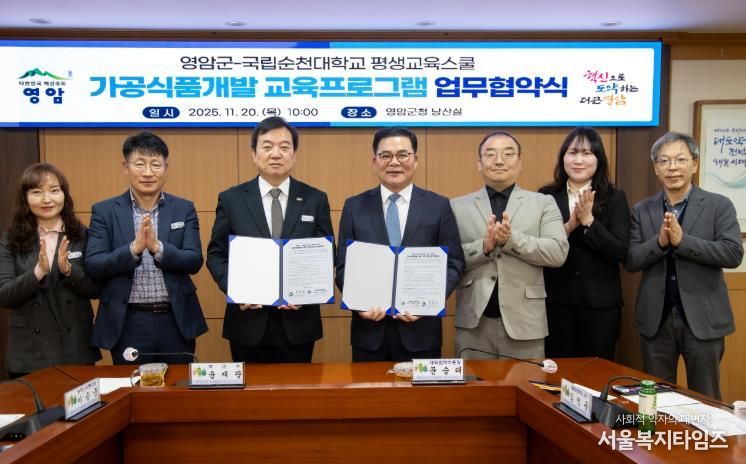 서울복지타임즈 이재연 기자 | 영암군이 20일 군청에서 국립순천대 평생교육스쿨과 ‘가공식품개발 교육프로그램 업무협약’을 체결했다.