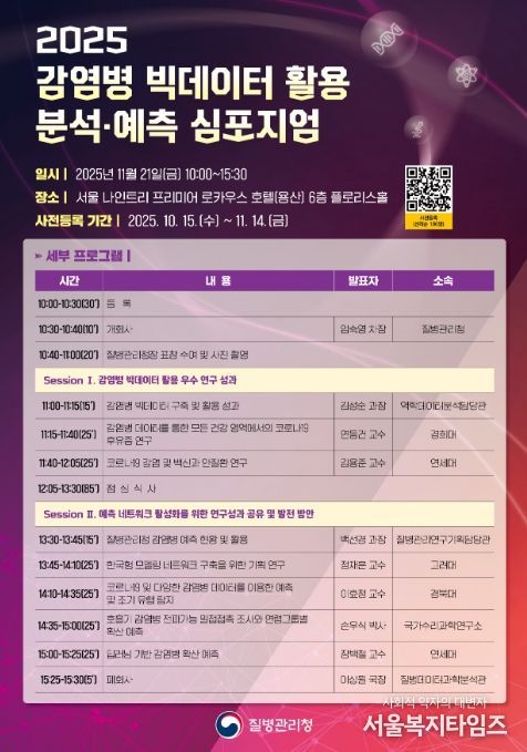서울복지타임즈 이재연 기자 | 질병관리청은 11월 21일 '2025 감염병 빅데이터 활용 분석·예측 심포지엄'을 개최하고, 연구성과를 공유하며 향후 데이터 기반 정책 고도화 방안을 논의한다.
