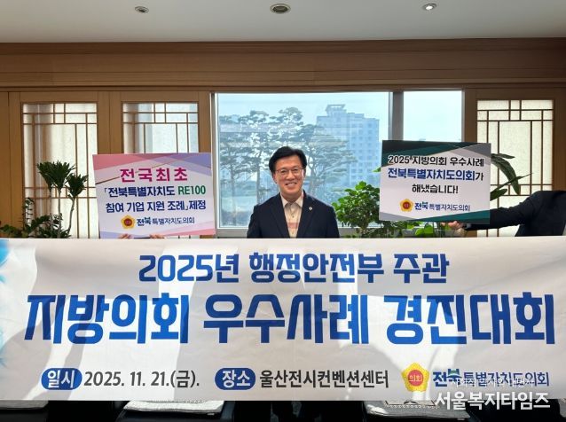 서울복지타임즈 이재연 기자 | 전북특별자치도의회가 지난 21일 울산전시컨벤션센터에서 열린 행정안전부 주관 ‘2025년 지방의회 우수사례 경진대회’에서 본선에 진출해 수상하는 영예를 안았다.