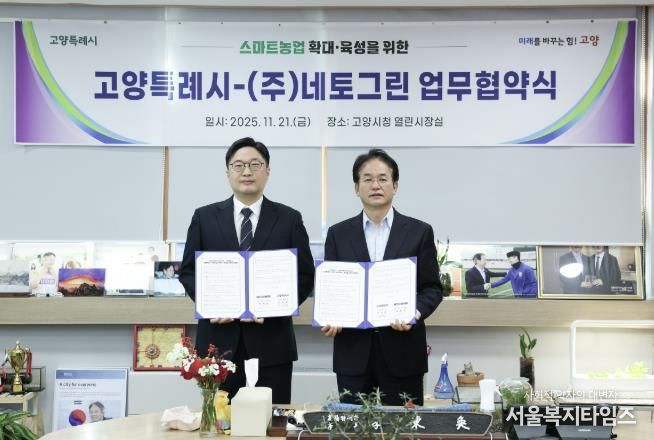 서울복지타임즈 이재연 기자 | 고양특례시는 지난 21일(금) ㈜네토그린과 ‘스마트농업 확대·육성을 위한 업무협약(MOU)’을 체결했다고 밝혔다.