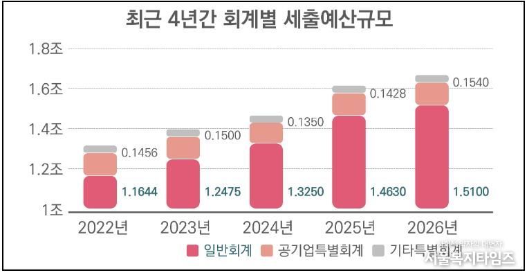 회계별 세출예산 규모를 살펴보면 일반회계는 1조 1,644억 원에서 1조 5,100억 원으로 3,456억 원(29.7%) 늘어났고, 특별회계는 1,456억 원에서 1,540억 원으로 84억 원(5.8%) 증가했다.