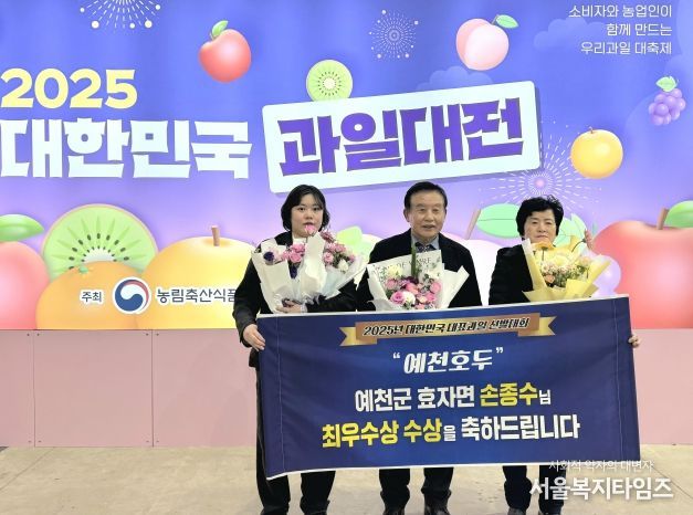 서울복지타임즈 이재연 기자 | 예천군은 ‘2025년 대한민국 대표과일 선발대회’ 산림과수분야에서 예천군 호두 재배 임가인 손종수 씨가 농림축산식품부장관상(최우수)을, 최운섭 씨가 산림청장상(우수)을 각각 수상했다고 27일 밝혔다.