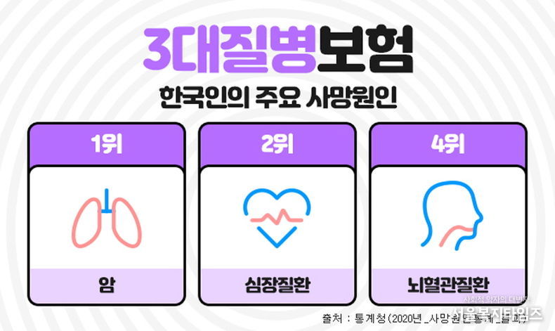 서울복지타임즈 이재연 기자 | 한국인의 주요 사망원인중에 암, 뇌혈관질환, 심혈관질환은 흔히 3대질병이라 일컬어지며 살아가면서 가장 먼저 대비해야 하는 중대질병으로 항상 강조되고 있다. 이들 질병에 미리 대비하기 위해 가입하는 것이 진단비보험인데, 이러한 3대질병진단비를 중점으로 보장하는 보장성보험이 3대진단비보험 이다. 3대질병진단비보험은 각각의 질병에 주목해서 보장하기도 하지만, 나에게 맞는 추가 특약을 잘 골라서 가입한다면 종합건강보험으로도 충분히 활용도가 높다.
