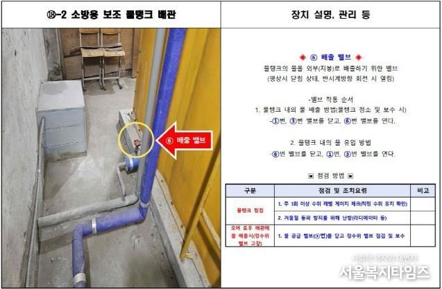 구체적 내용은 ▲화재수신반 오작동 조치 방법 ▲수도 잠금 방법 ▲도시가스 잠금 방법 ▲전기 차단기 조치 방법 ▲옥외 주요시설 배치도 ▲동파 예방 지도 ▲기계설비 현황 ▲물탱크 현황 등으로 실질적인 대응 방법을 포함했다.