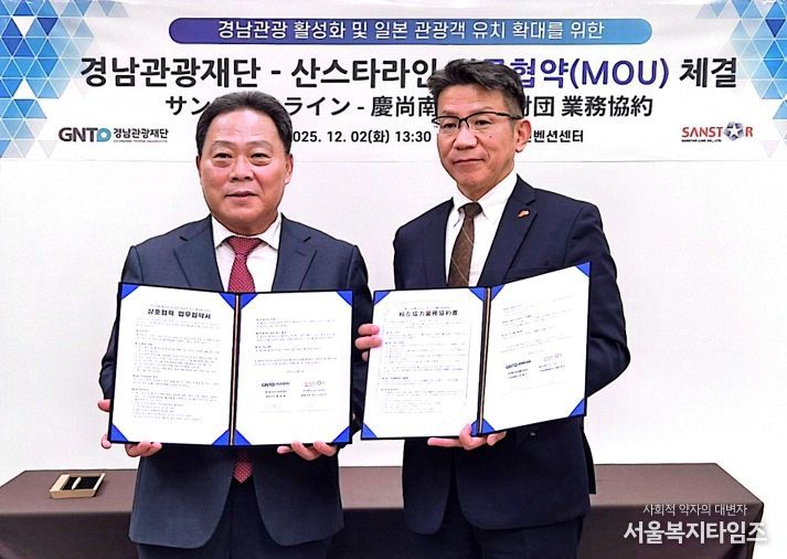 서울복지타임즈 이재연 기자 | 경남관광재단은 12월 2일 창원컨벤션센터에서 팬스타그룹 일본 현지법인인 ‘산스타라인(SANSTAR LINE)’과 ‘경남 관광 활성화 및 일본 관광객 유치 확대’를 위한 업무협약(MOU)을 체결했다고 밝혔다.