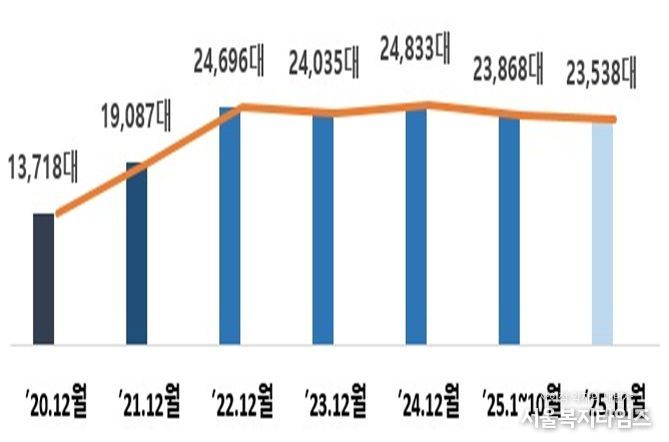 지난해 심야시간대 택시 영업건수가 11월 46,160건→ 12월 50,838건으로 약 10.1% 증가한 것으로 보아 올해도 작년과 비슷한 수준(2025년 11월 영업건수 45,054건)일 것으로 예상된다. 최근 서울 택시 운행대수는 일평균 45,799대로 전년(45,736대) 대비 63대 증가, 심야(22~02시)는 평균 23,423대로 전년(23,105대) 대비 318대 늘어난 것으로 보아 연말이 다가오면서 운행량이 소폭 오르고 있는 것으로 분석됐다.(10월 3주~11월 3주 기준)