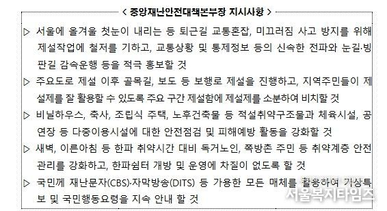 아울러, 국민께서도 기상정보를 수시로 확인하고, 주간 시간대 안전한 상황에서 제설작업을 실시하는 등 국민행동요령을 준수해 주실 것을 당부했다.