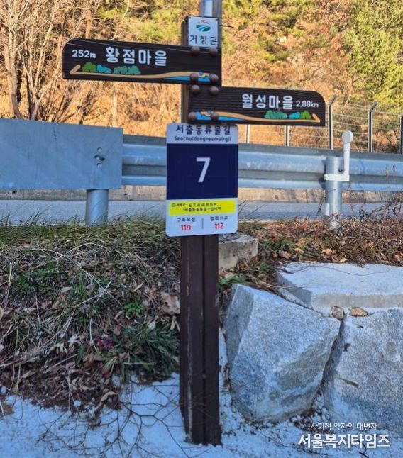 서출동류물길은 기존에 조성된 트레킹코스 약 6km 구간에 지상도로(숲길)명을 연계해 기초간격 20m 단위로 1~614번의 기초번호를 부여했으며, 경찰·소방과 사전협의를 통해 위치정보 표시가 필요한 62개 지점에 기초번호판을 설치 완료했다.