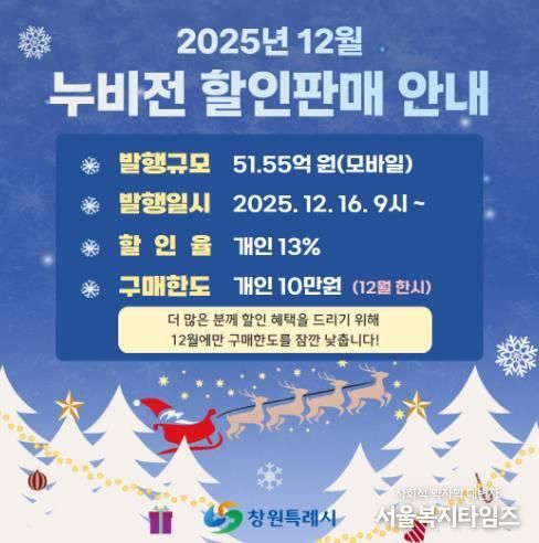 서울복지타임즈 이재연 기자 | 창원특례시는 연말 가계부담 완화와 지역경제 활성화를 위해 오는 12월 16일 오전 9시부터 ‘모바일 누비전’ 51.55억 원을 추가 발행한다.