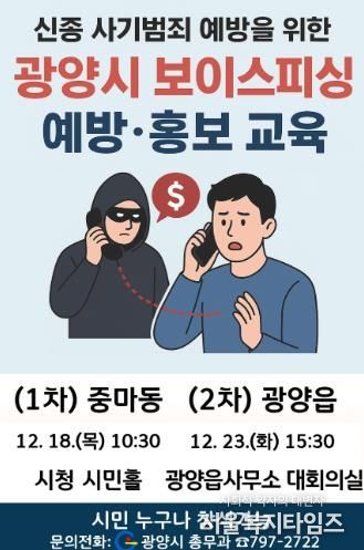 서울복지타임즈 이재연 기자 | 광양시는 최근 중앙부처·지자체 공무원 사칭 범죄가 전국적으로 증가하고 쿠팡 개인정보 대규모 유출 등 시민 불안이 확산됨에 따라, 신종 보이스피싱 사기범죄 예방을 위해 전 시민을 대상으로 보이스피싱 예방·홍보 교육을 실시한다고 밝혔다.