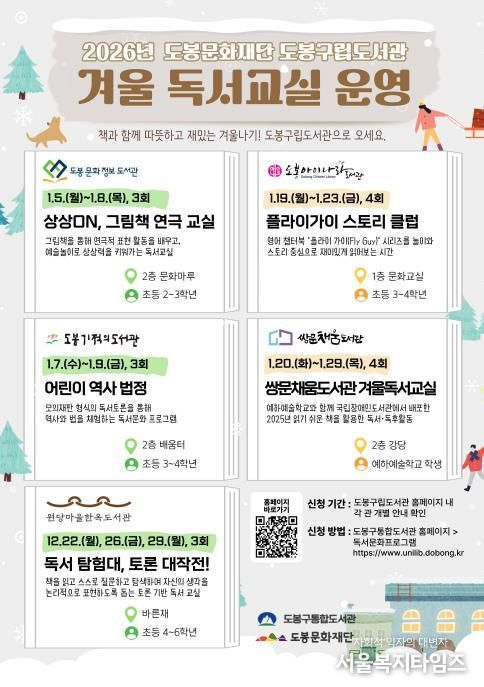 서울복지타임즈 이재연 기자 | 서울 도봉구 도봉문화재단 소속 구립도서관 5개관이 ‘2026년 겨울 독서교실’을 운영한다.