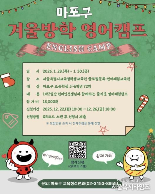 서울복지타임즈 이재연 기자 | 마포구는 겨울방학을 맞아 관내 초등학교 5~6학년 학생 72명을 대상으로 2026년 1월 29일부터 30일까지 1박 2일 일정의 겨울방학 영어캠프를 운영한다.