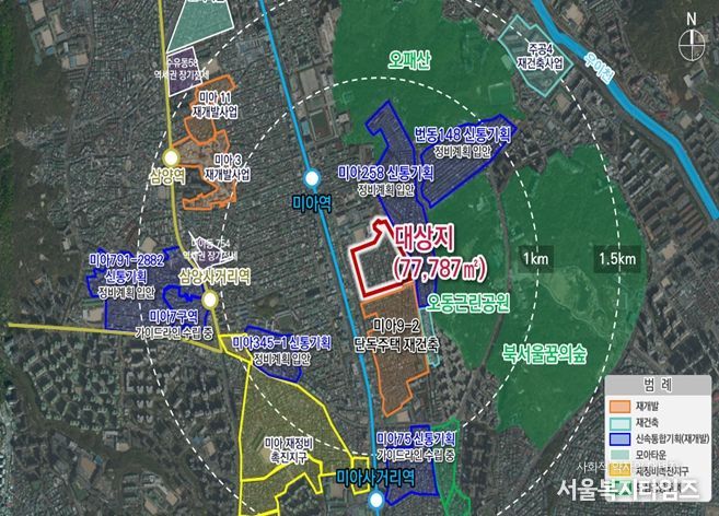 이번 신속통합기획은 과거 주택단지 중심 개발로 시가지와 단절됐던 오패산 녹지축을 미아역(도봉로) 일대까지 확장하고, 입체공원 도입과 사업성 보정계수(1.8) 적용을 통해 총 1,730세대, 최고 35층 규모의 쾌적하고 안전한 주거단지를 조성하는 것이 핵심이다.
